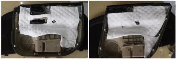 下面開始門板的隔音,技師用兩塊減震板分別鋪滿內(nèi)外門板,隔音施工完畢形成一個密封的箱體。