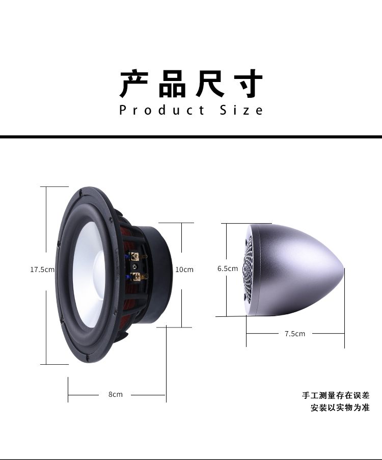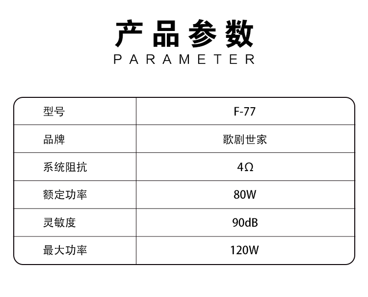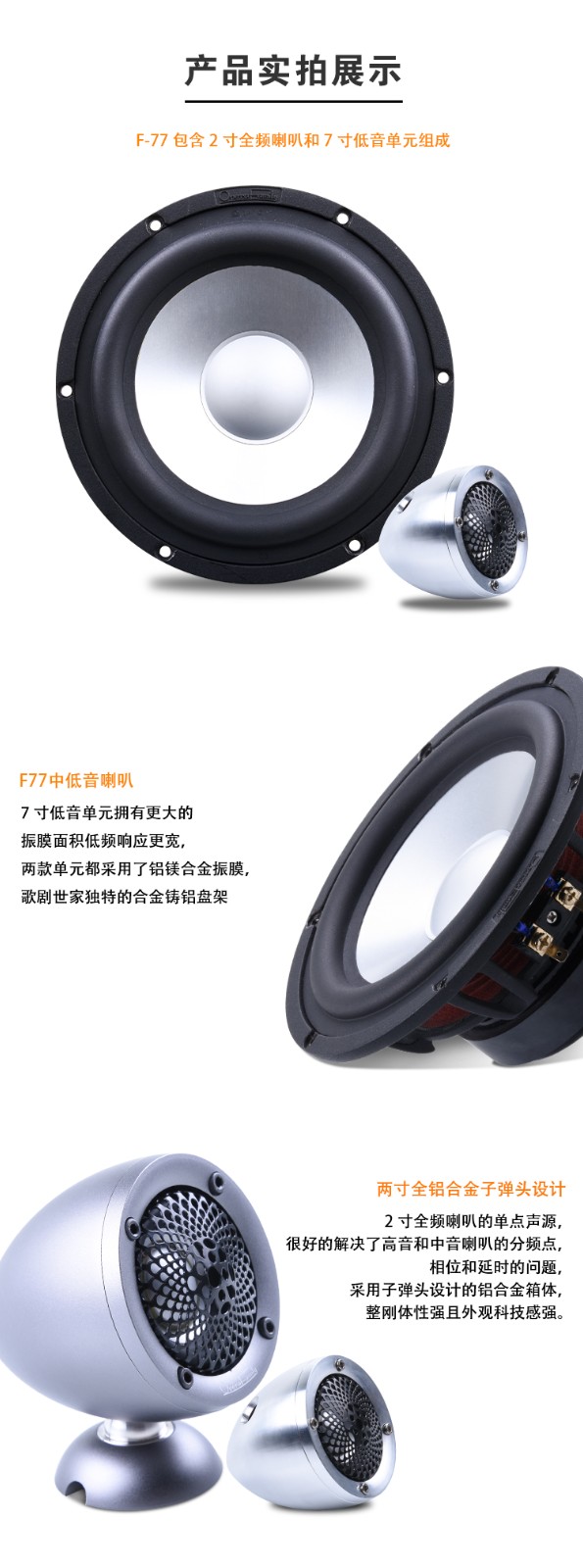 歌劇世家F-77全頻兩分頻喇叭:產(chǎn)品由2寸全頻喇叭和7寸低音單元組成。2寸全頻喇叭單元的單點聲源,很好地解決了高音和中音喇叭的分頻點、相位和延時等問題。全頻喇叭單元則采用了子彈頭設(shè)計的鋁合金箱體,整體剛性強且外觀科技感強。7寸低音單元擁有更大的振膜面積,低頻響應(yīng)更寬。兩款單元都采用了歌劇世家獨家的鋁鎂合金振膜和合金鑄鋁盆架。 產(chǎn)品參數(shù):額定功率:80W / 最大功率:120W / 靈敏度:90dB / 系統(tǒng)阻抗:4Ω