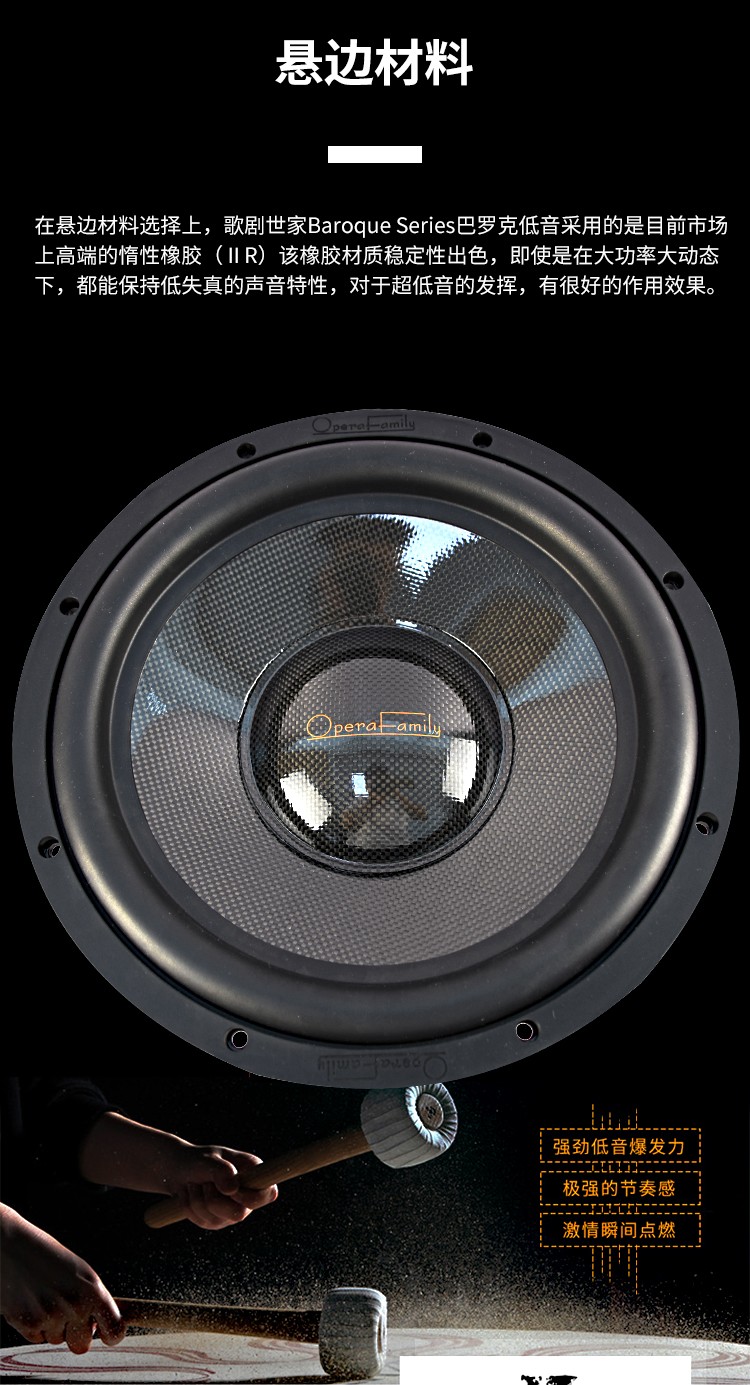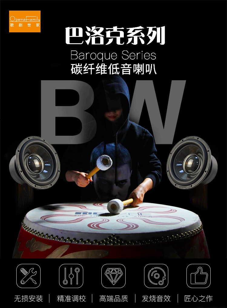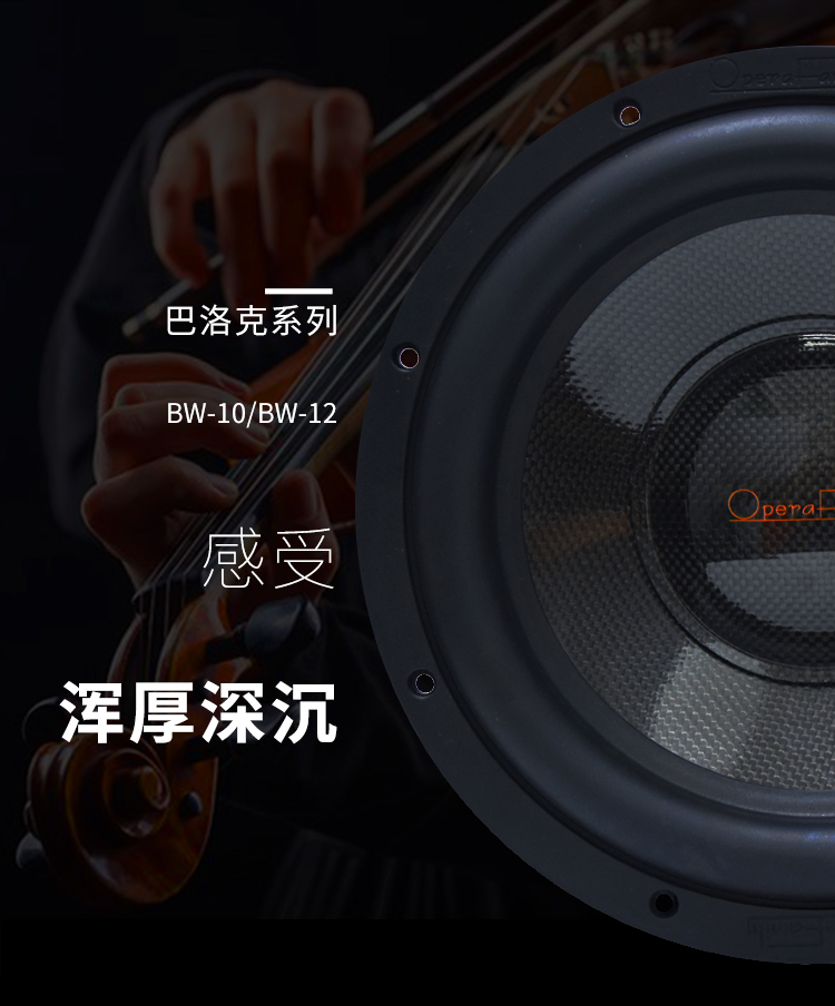 品牌: Opera family/歌劇世家巴羅克系列 型號: BW12寸 低音喇叭 顏色分類: 10寸 12寸 碳纖音盤,航空鋁盤架,額定500W
